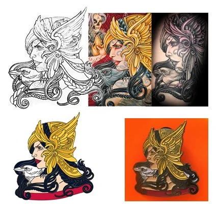 Artist’s illustration converted to vector drawing (bottom row) which was used for enamel pin